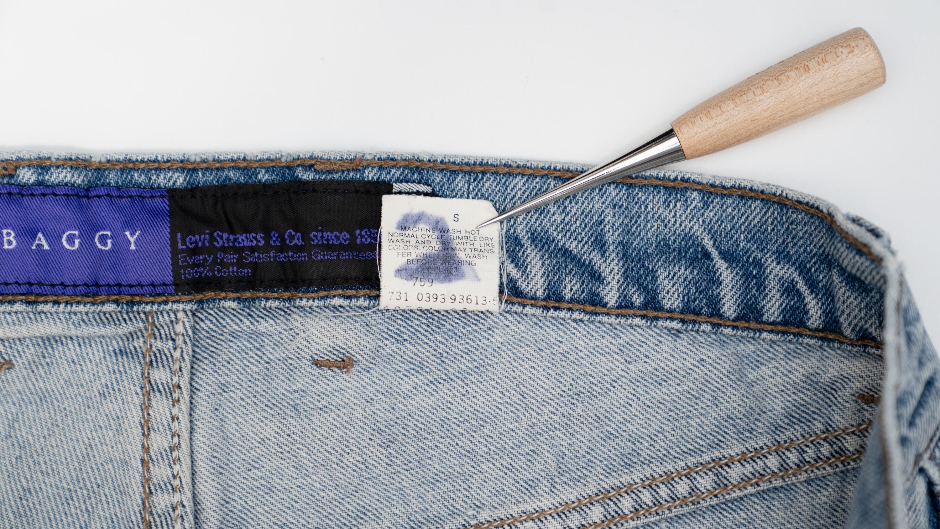 裾、フロントフライ、 背面のポケットの角に擦れがあります。タグに書き込みがあります。多少の使用感がございますが、目立ったダメージはなく年代を考慮しても良い状態と言えます。